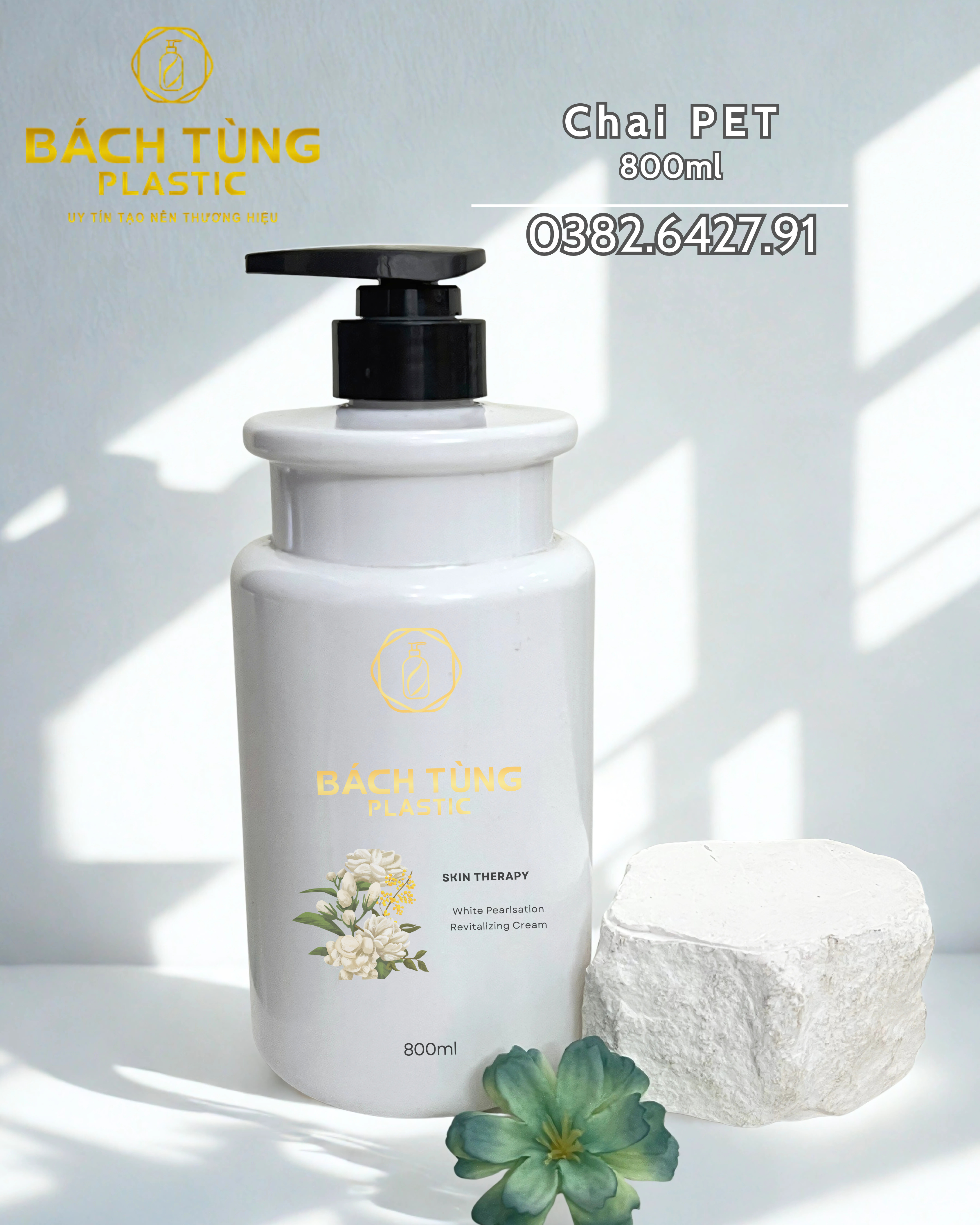 Chai PET tròn dung tích 800ml, màu trắng tinh tế, kết hợp cùng nắp FI33 đen & trắng sang trọng và tiện dụng. Với thiết kế thân tròn chắc chắn, chai phù hợp cho các sản phẩm chăm sóc cá nhân, mỹ phẩm, hoặc dung dịch tẩy rửa cao cấp.