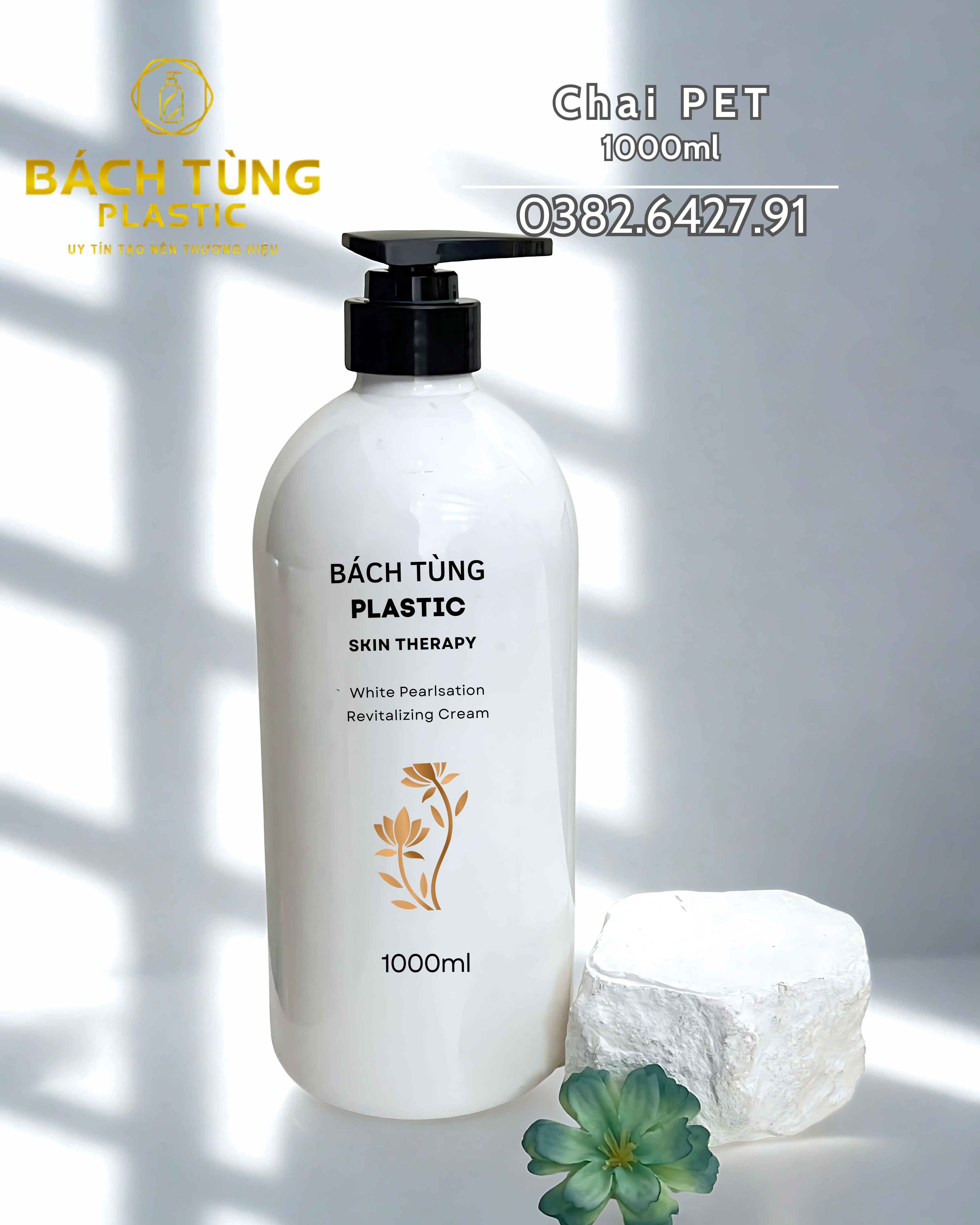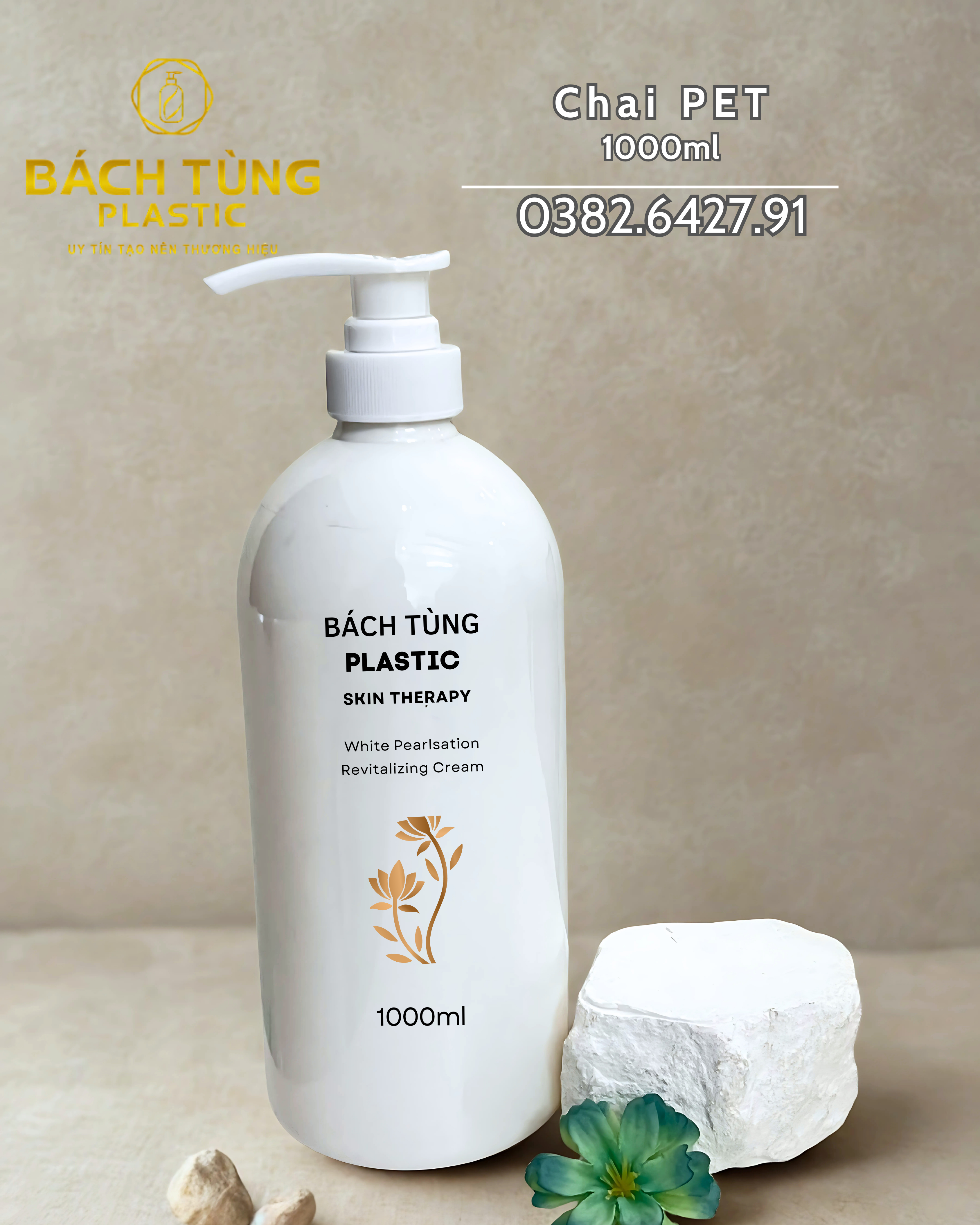 Chai PET 1000ml thiết kế dáng tròn, vai tròn mềm mại, màu trắng tinh tế. Sản phẩm có thể kết hợp linh hoạt với nhiều loại nắp FI33 như: nắp vặn, vòi pump, vòi nhấn, phù hợp với đa dạng nhu cầu sử dụng từ mỹ phẩm đến sản phẩm gia dụng.