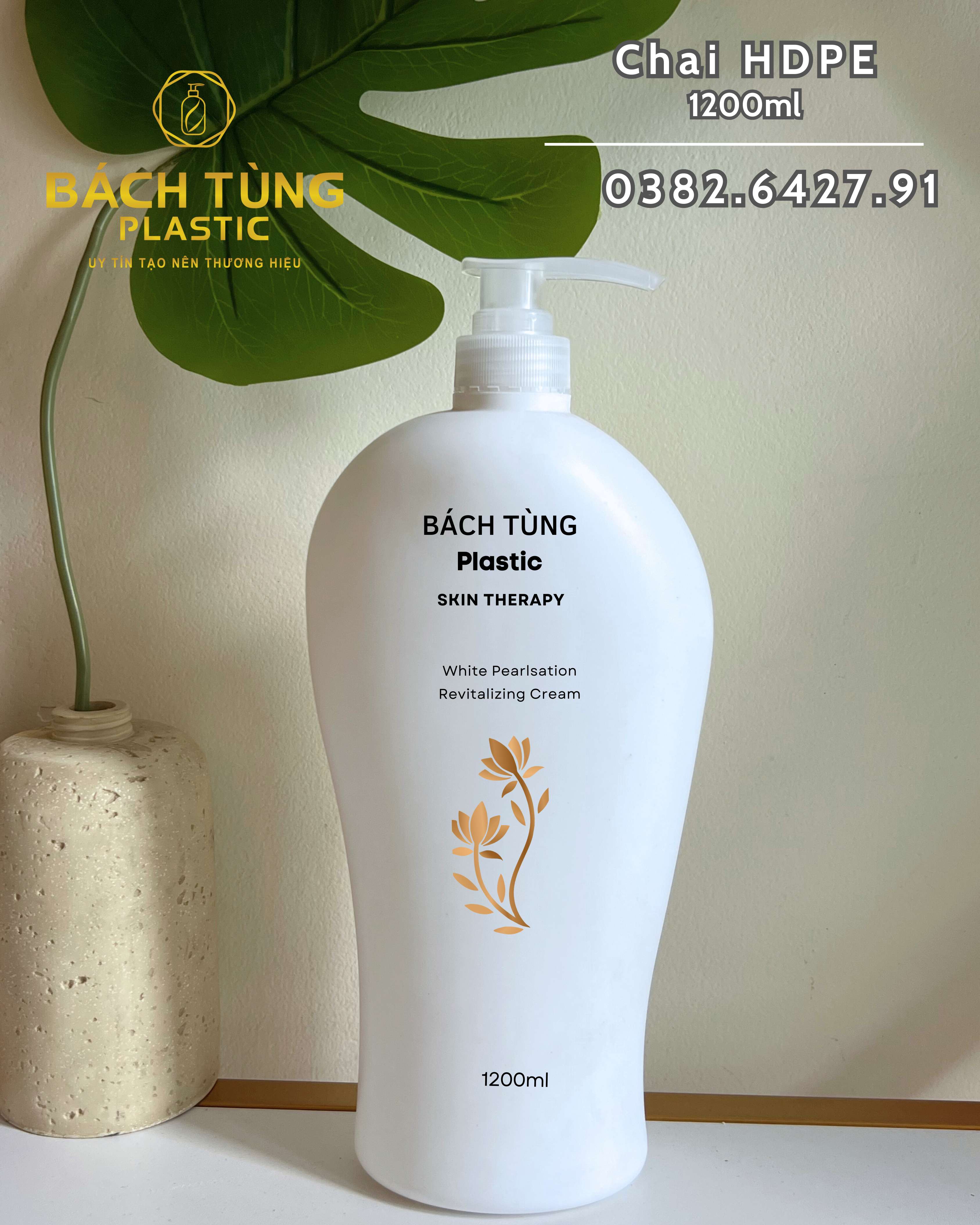 Chai HDPE dung tích 1200ml với thiết kế dáng bầu lớn hiện đại, nổi bật với gam màu trắng tinh tế, mang lại cảm giác sang trọng, thanh lịch và phù hợp với nhiều dòng sản phẩm cao cấp. Thân chai bo tròn mềm mại, cầm chắc tay, tạo trải nghiệm thoải mái và thẩm mỹ cao. Với cổ FI33 tiêu chuẩn, chai dễ dàng kết hợp với nắp nhấn, vòi xịt hoặc nắp vặn, đáp ứng đa dạng nhu cầu sử dụng cho mỹ phẩm, hóa mỹ phẩm, spa và sản phẩm gia dụng.