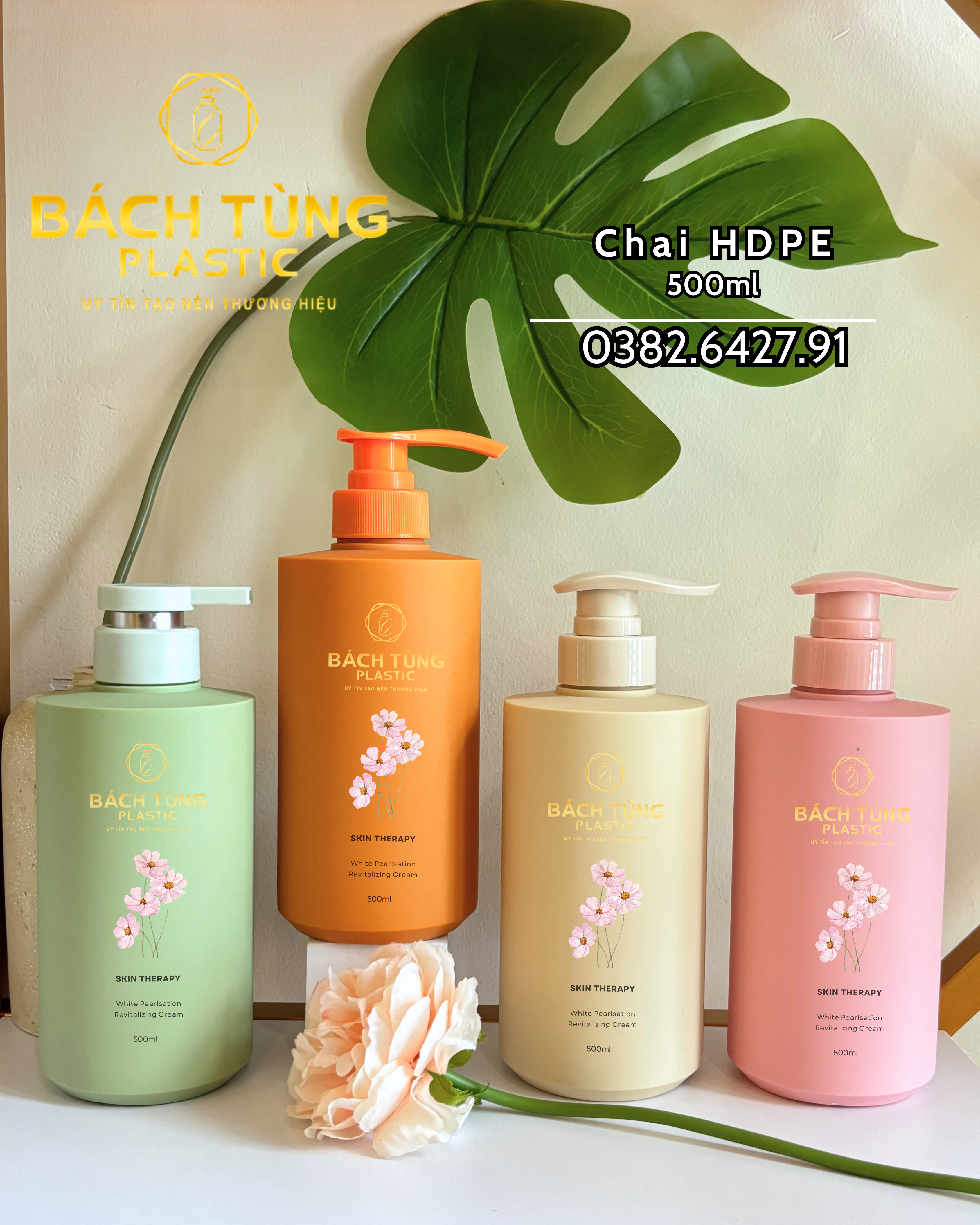 Chai HDPE dáng tròn 500ml với 4 gam màu trẻ trung Hồng, Cam, Xanh lá, Be mang đến vẻ ngoài hiện đại, nổi bật và dễ phối hợp với hình ảnh thương hiệu. Thiết kế thân tròn mềm mại, dễ cầm nắm, thích hợp cho dầu gội, dầu xả, sữa tắm, lotion, toner hoặc mỹ phẩm handmade.