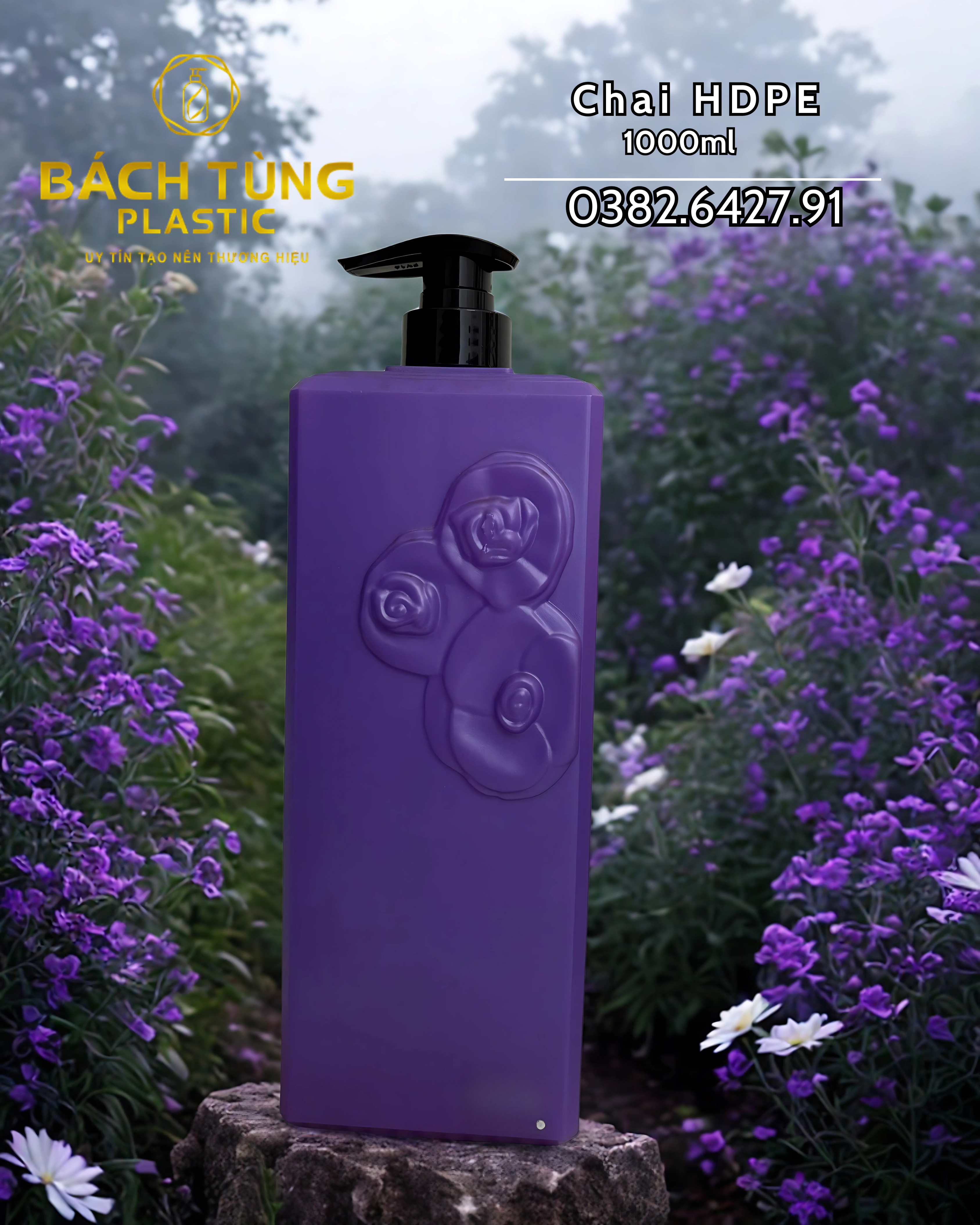 Chai nhựa HDPE dung tích 1000ml với màu tím ngọt ngào và sang trọng, điểm nhấn đặc biệt là họa tiết nổi 3 bông hoa trên thân chai, giúp tạo sự tinh tế và khác biệt. Chất liệu HDPE cao cấp đảm bảo độ bền, chống va đập tốt và an toàn cho thực phẩm, mỹ phẩm.