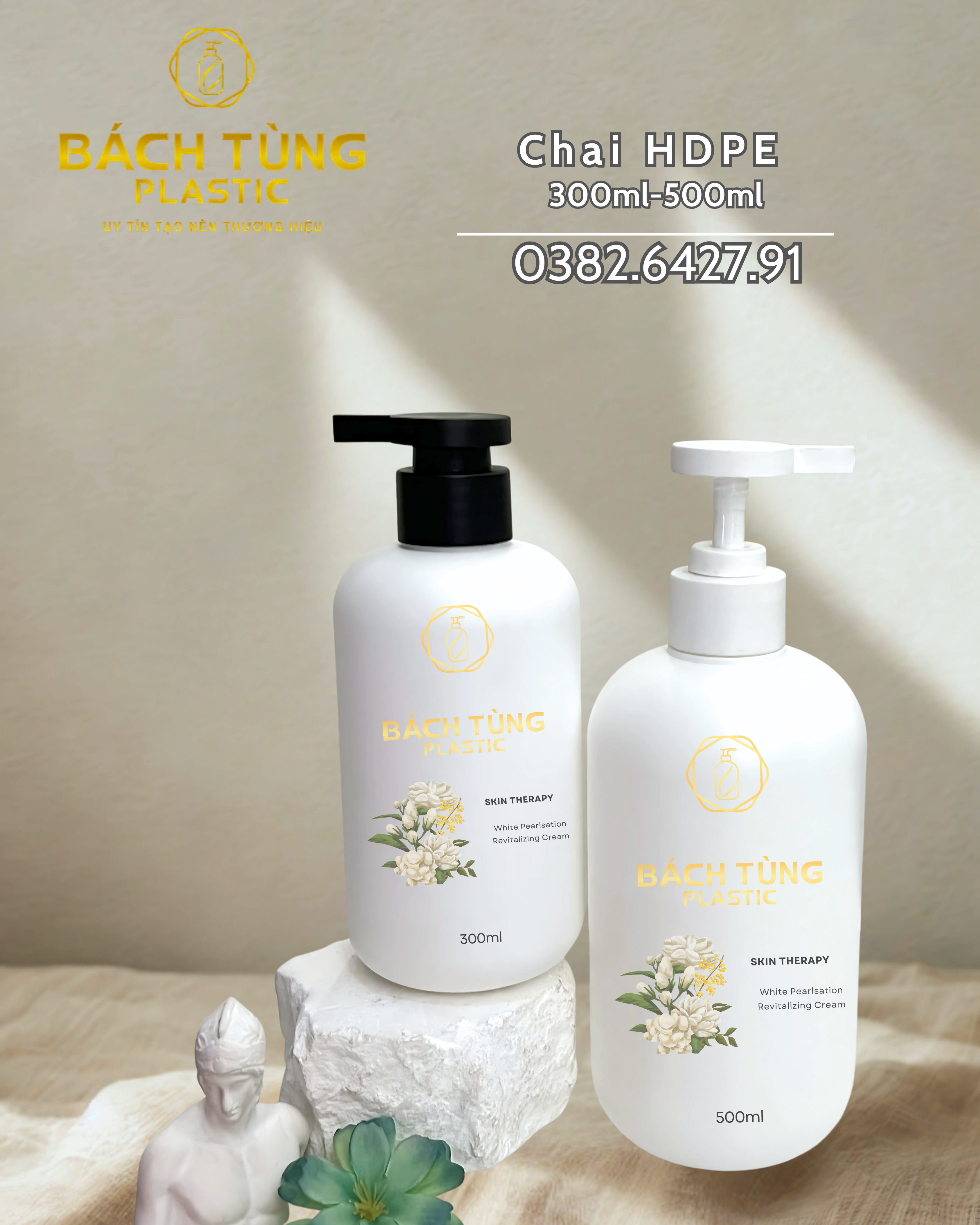 The premium round HDPE bottles from Bach Tung Plastic feature a sleek white finish with a modern and elegant design. Available in two popular sizes, 300ml and 500ml, these bottles come with FI28 press pump caps in two classic colors: white and black.